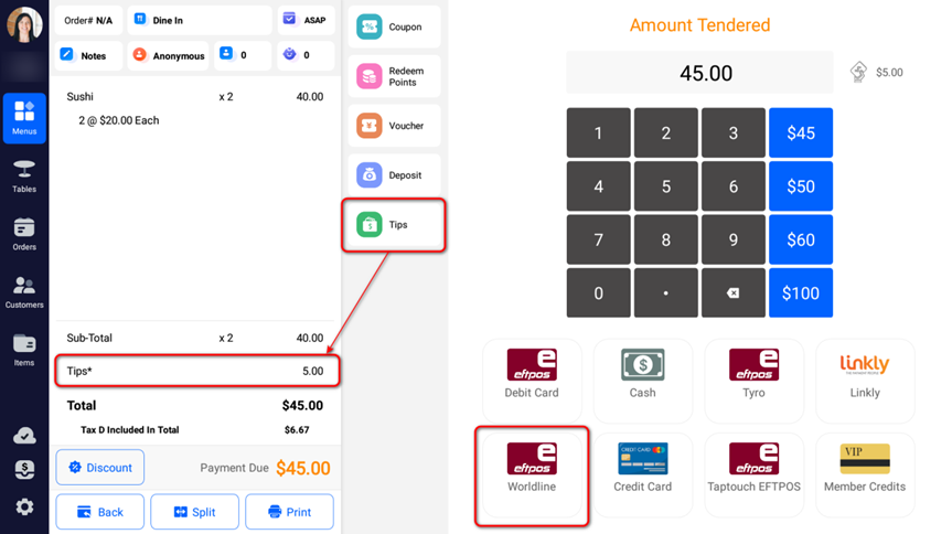 3. After adding the tip, click the Worldline icon in the payment area on the right side of the page to process the payment.