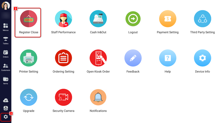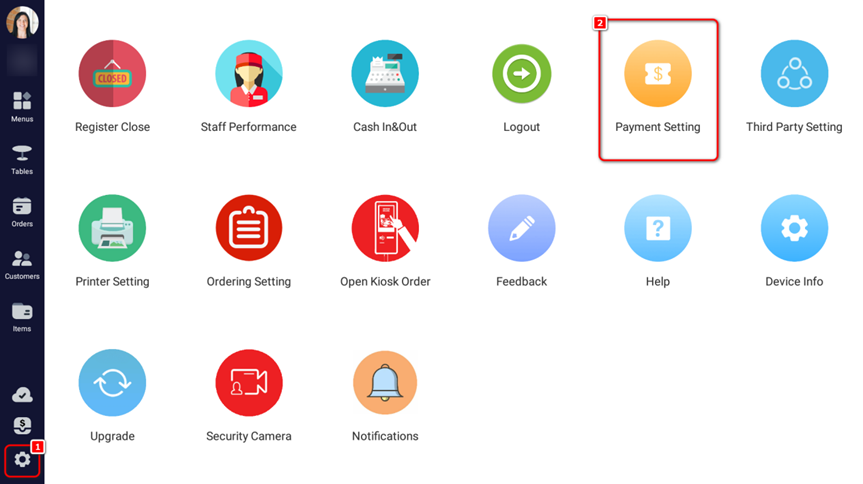 1. Click the gear icon at the bottom of the left navigation bar on POS to enter the settings page.