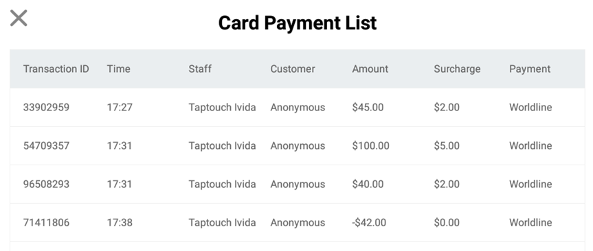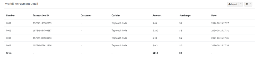 4. The transaction records for Worldline payments will be displayed, including key data such as Transaction ID, customer name, order amount, surcharge, transaction time, and more.