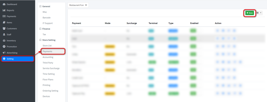 1. Log in to the POS backend and go to the Setting > Store Setting > Payments page.