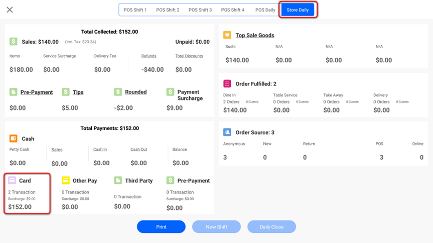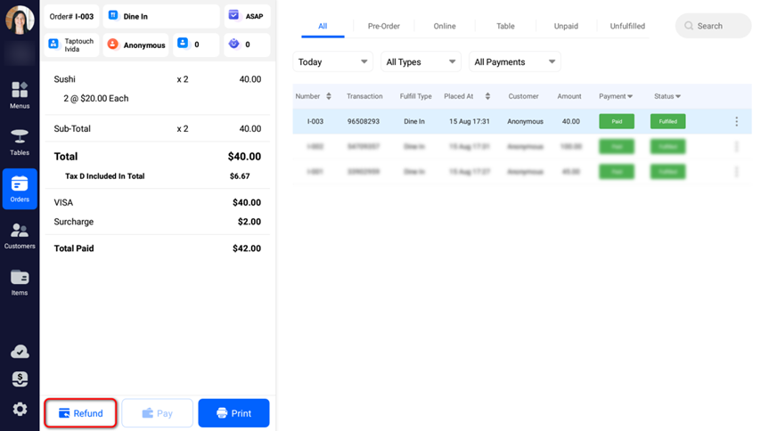 1. On POS, go to the order page, select the order to be refunded, and click Refund at the bottom left of the order page.